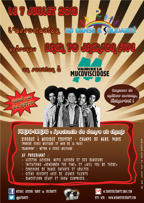 L’association MJ Danse & Solidarité a organisé le dimanche 7 juillet 2013, au Champs de Mars, à Paris, un grand spectacle de chant et de danse de 4h, en soutien de Vaincre la Mucoviscidose.